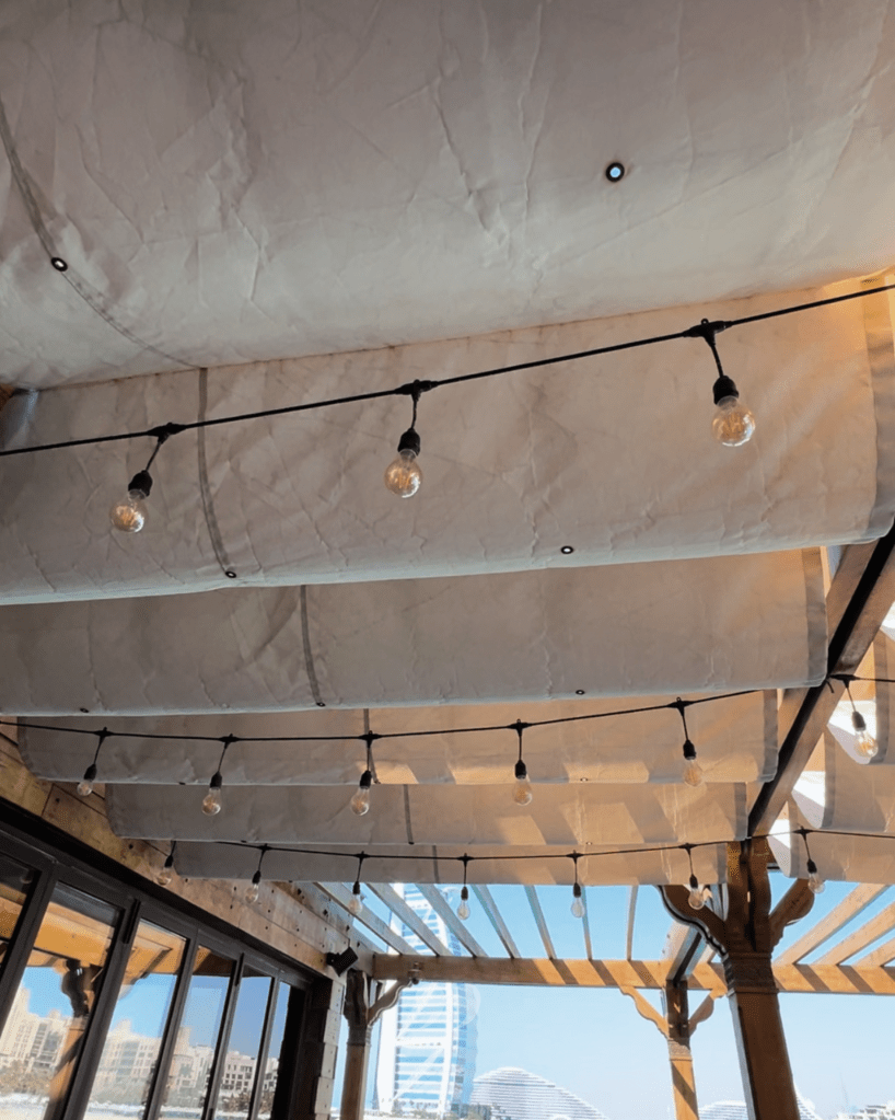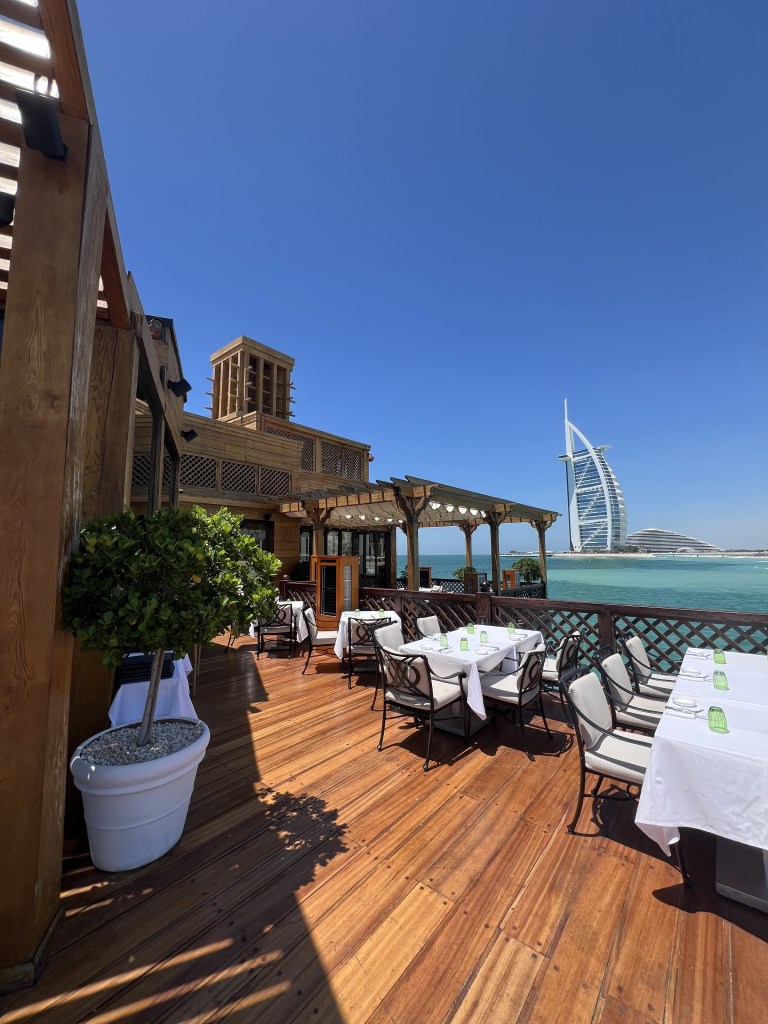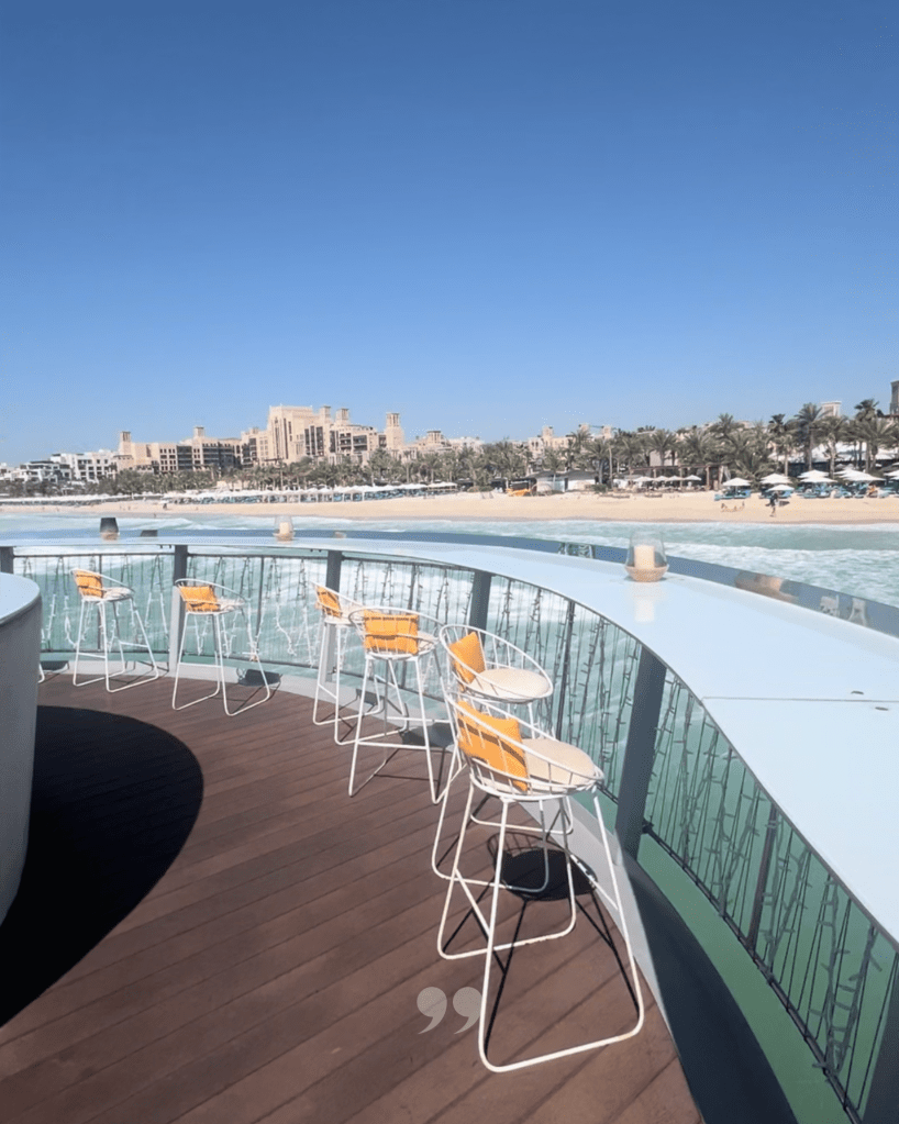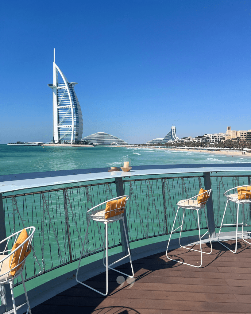 As we approached Pier Chic, we were struck by its stunning location. The wooden pier extended out into the peaceful waters of the Arabian Gulf, offering breath-taking views of the beach and the iconic Jumeirah Beach Hotel and Burj Al Arab in the distance. The atmosphere was serene, with a refreshing sea breeze adding to the tranquil ambiance.