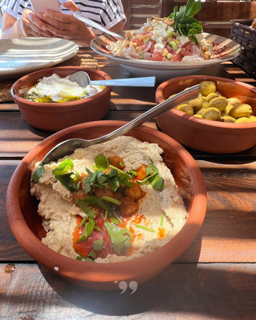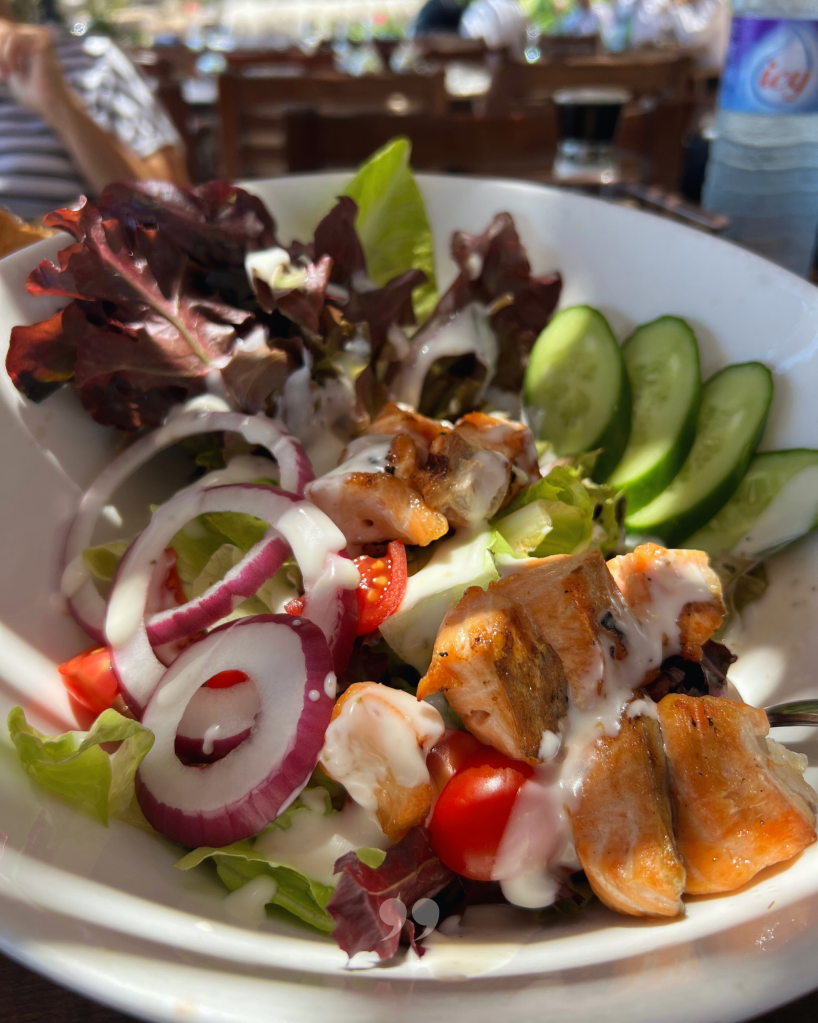 For those who love seafood, Körfez does not disappoint. We also sampled the salmon salad and a vegetable and feta salad, both of which were fresh and delicious. Additionally, a small selection of mezze, including hummus, olives, cacik and bread, was brought to our table unprompted. This delightful surprise added an extra touch to our meal, showcasing the restaurant’s generosity and commitment to hospitality.