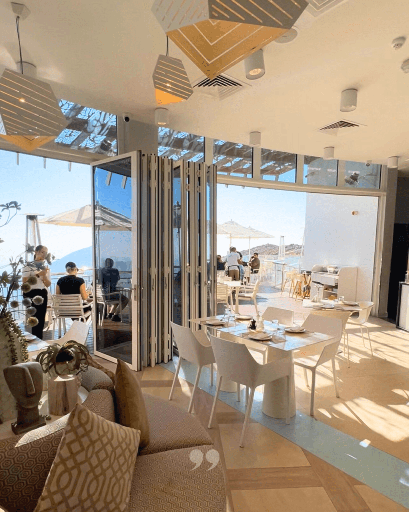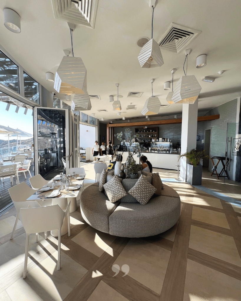 The restaurant offers both indoor and outdoor seating options. While the interior is sleek and modern, with large windows that allow natural light to flood in, I highly recommend choosing an outdoor seat. Sitting outside means you’ll be treated to an uninterrupted view of the rocky mountain landscape stretching endlessly in every direction. On clear days, the blue skies contrast beautifully with the rugged terrain and you might even feel like you’re dining in the clouds.