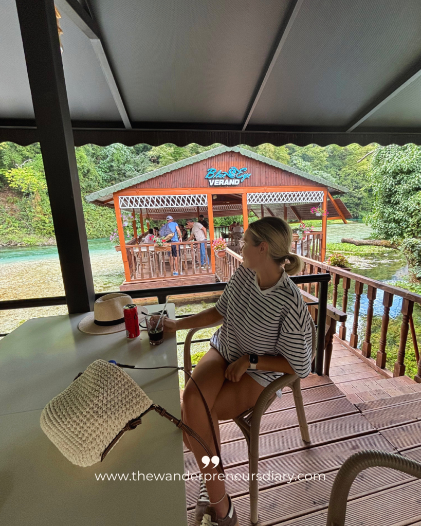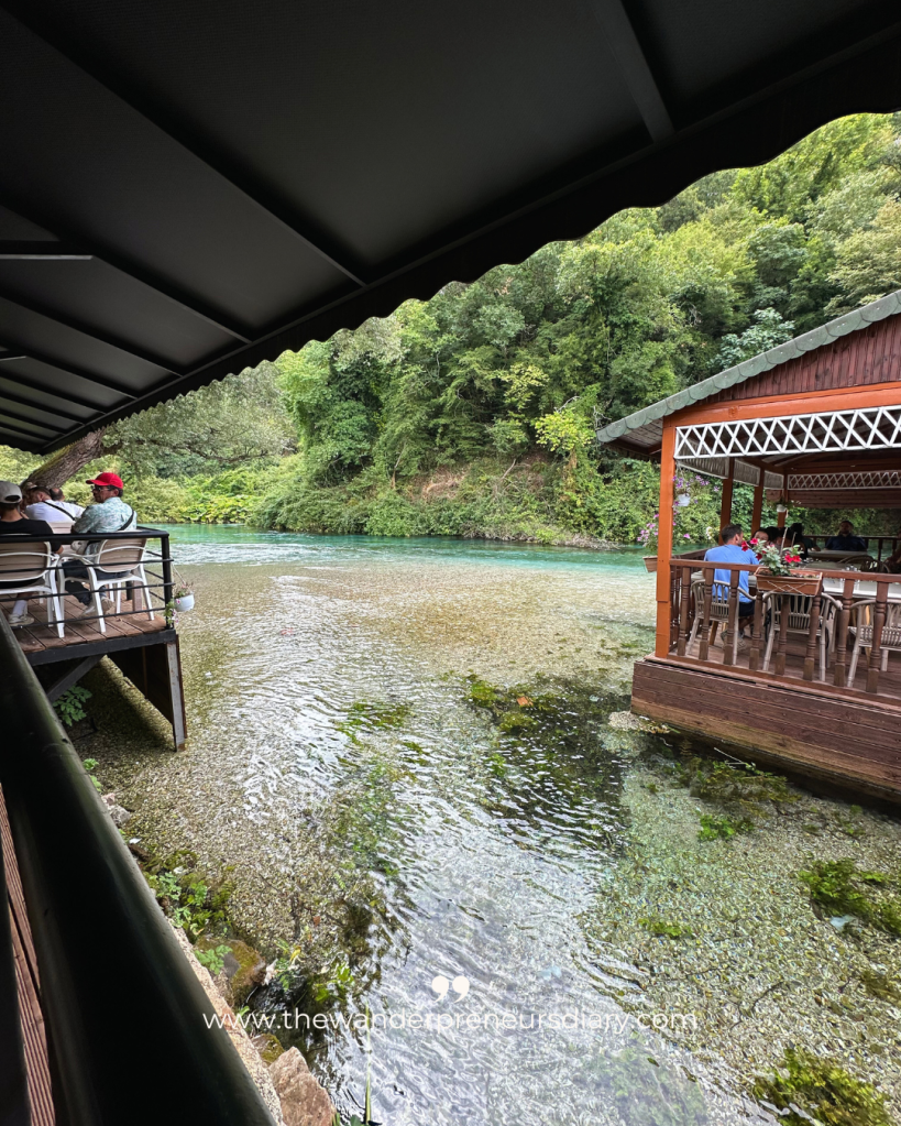 From the main spring, you can follow a short path along the river to a small café that sits right on the water’s edge. It’s a quiet spot for a drink or something to eat, with a few cabins nearby if you want to stay overnight. The water stays incredibly clear the whole way downstream.