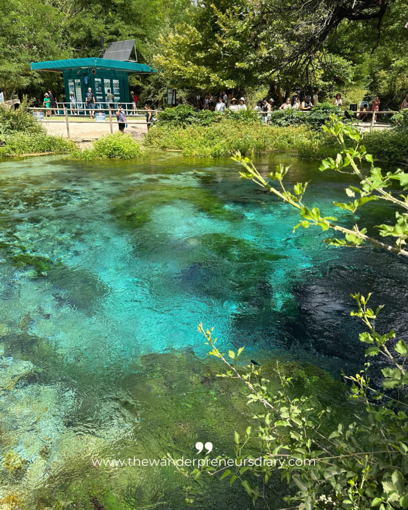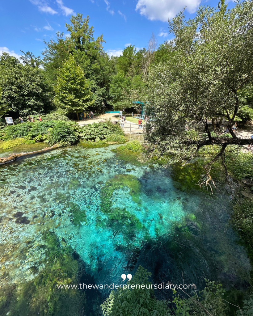 The spring itself is small but it’s impressive. The deep blue centre looks almost like ink and you can clearly see the movement of the water as it rises to the surface. There’s a viewing platform and a few shaded areas where you can stop and take photos or just sit for a while.